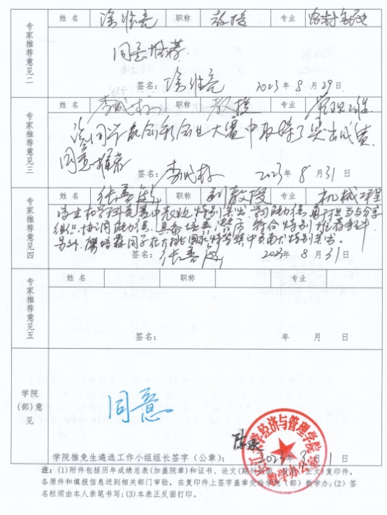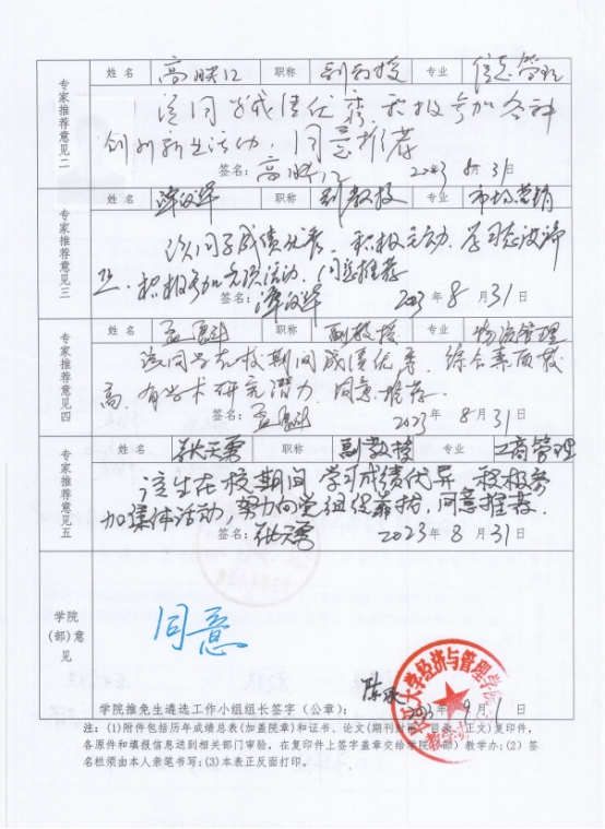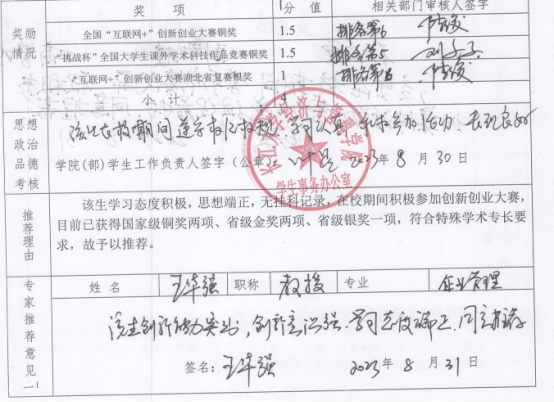 冯硕,男,学号202003175,学院信息管理与信息系统专业本科生。获得全国“互联网+”创新创业大赛铜奖 、“挑战杯”全国大学生课外学术科技作品竞赛铜奖和“互联网+”创新创业大赛湖北省复赛银奖;廖培霖,男,学号202004912,学院金融学本科生。获得第八届“互联网+”大学生创新创业国家金牌、第十三届“挑战杯”大学生创业计划竞赛国家银奖和第八届“互联网+”大学生创新创业省银奖。根据《长江大学推荐优秀应届本科毕业生免试攻读硕士学位研究生管理办法(试行)》(长大校发 〔2020〕106号)和关于做好推荐2024届优秀本科毕业生免试攻读硕士学位研究生工作的通知》等文件精神和通知要求,9月1日13:00-13:30在文科大楼417开展特殊学术专长答辩会,经答辩决定同意冯硕和廖培霖进行2024届研究生推免申请(不是正式推免)。 现通过太阳集团官网网站主页予以公示,公示日期为2023年9月1日至2023年9月3日,如有异议,请于2023年9月3日前与学院教学办联系,电话:0716-8060985。先将材料公示如下: