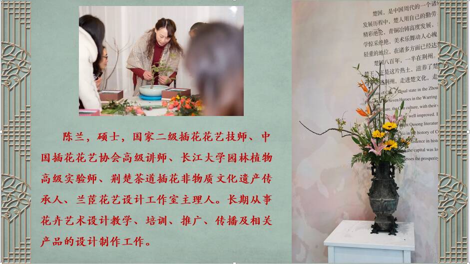 特别邀请国家二级插花花艺技师、中国插花花艺协会高级讲师、长江大学园林植物高级实验师、荆楚茶道插花非物质文化遗产传承人、兰茞花艺设计工作室主理人陈兰,介绍常见花材的名称、养护方案、花材的挑选,配色和养护知识;讲解此次插花的设计和制作过程;讲解花材的处理和修剪方法。